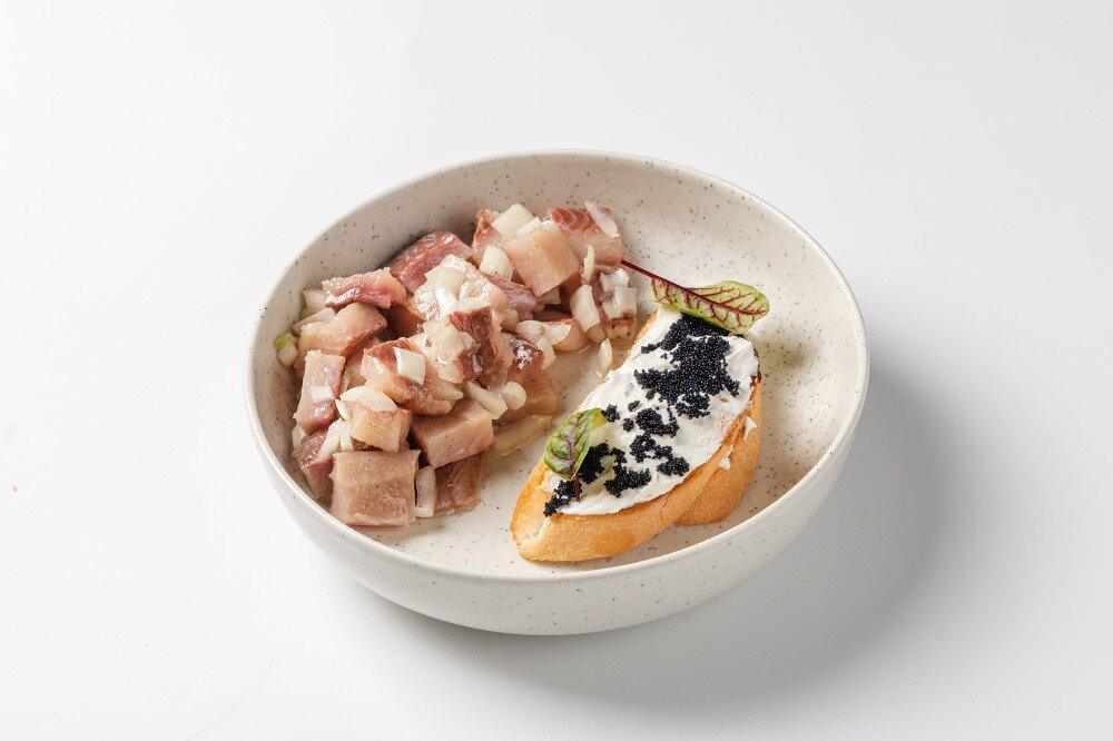 Муксун, лук,масло растительное, багет, сыр творожный, сливки, икра масага