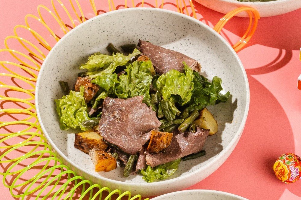 говядина,картофель, фасоль стручковая, салатный лист, грибной соус