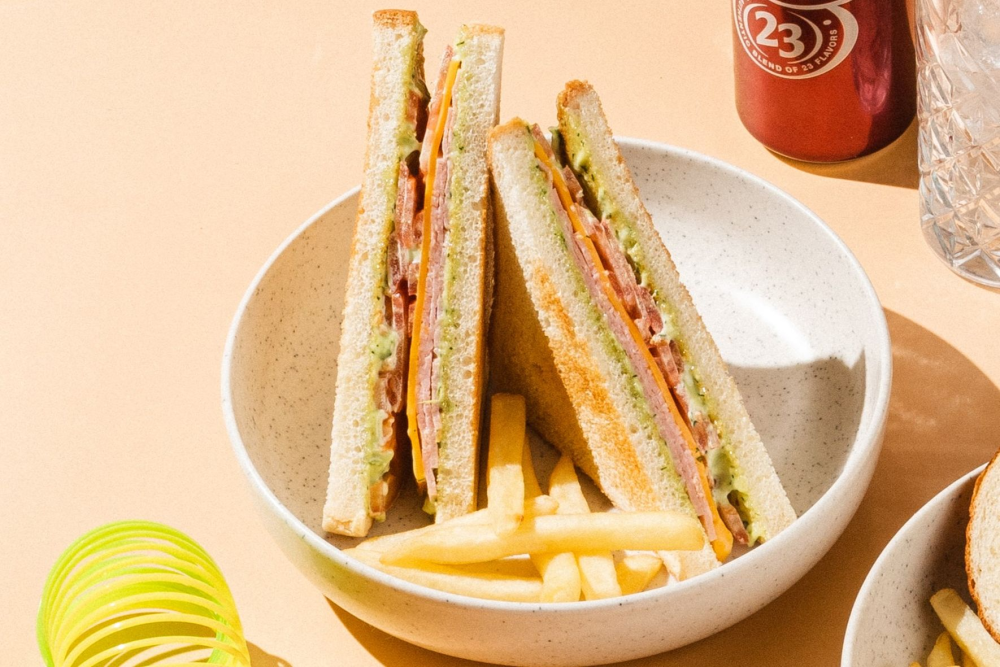 хлеб тостовый, ветчина, салатный лист, помидор, сыр чедер, соус французский