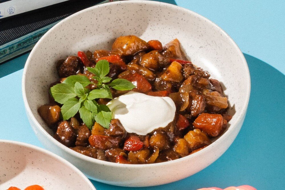 свинина, морковь, картофель, болгарский перец, чеснок, зелень, соус демиглас
