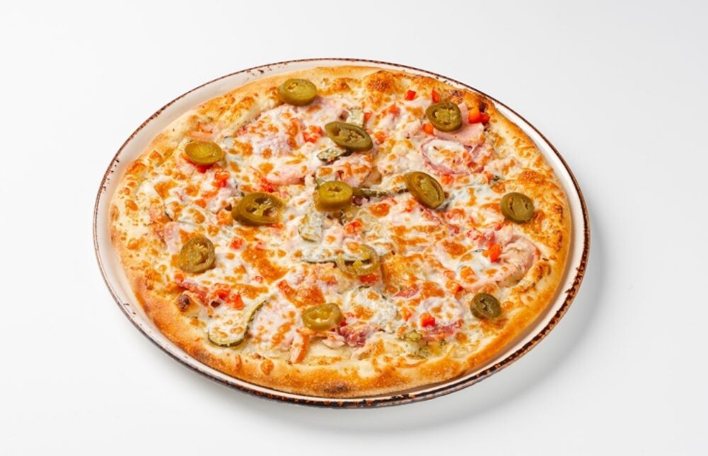 тесто для пиццы, куриное филе подкопченое, пепперони, ветчина, бекон, огурец маринованный, перец болгарский, сыр моцарелла, соус француз, перец халапеньо
